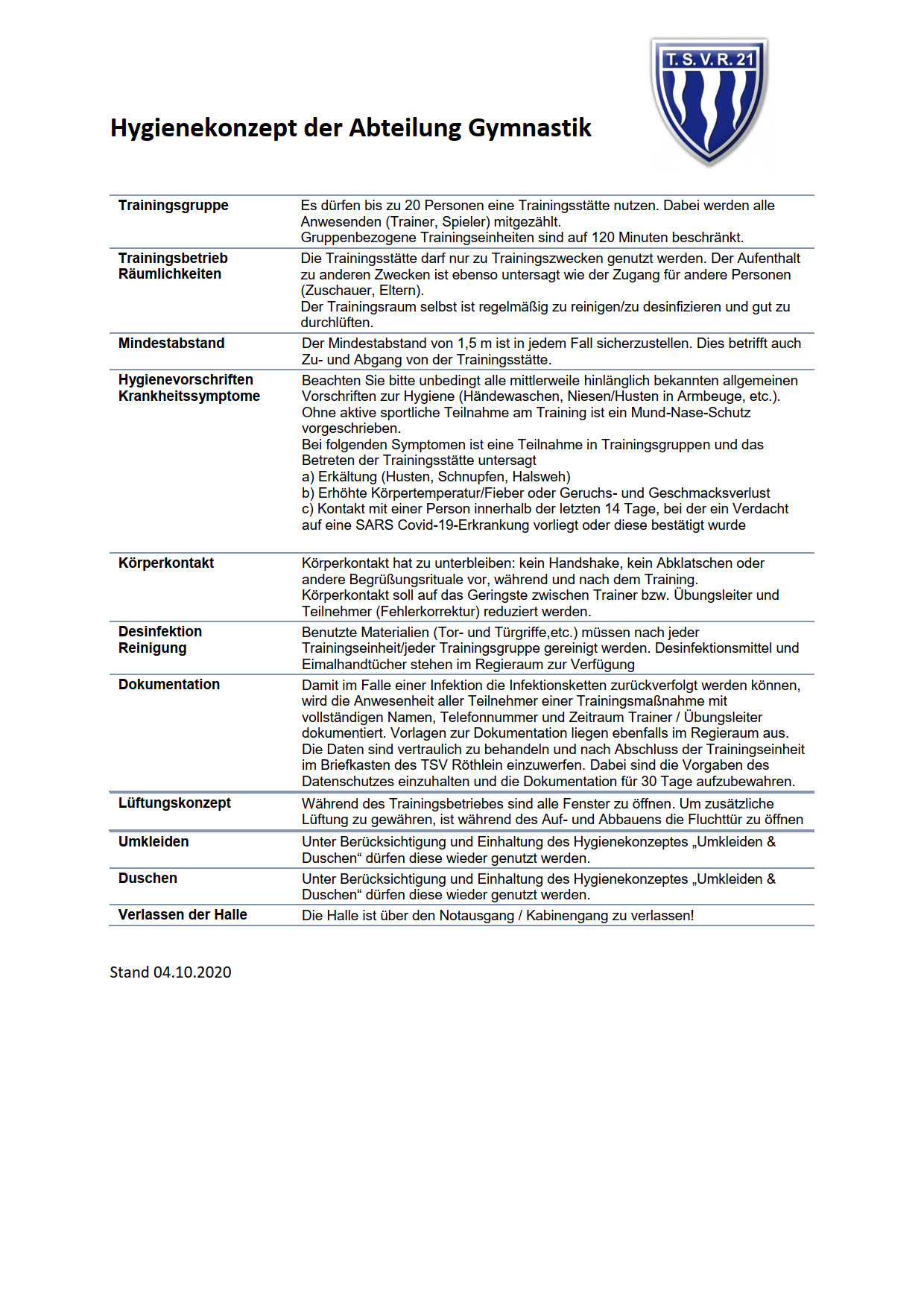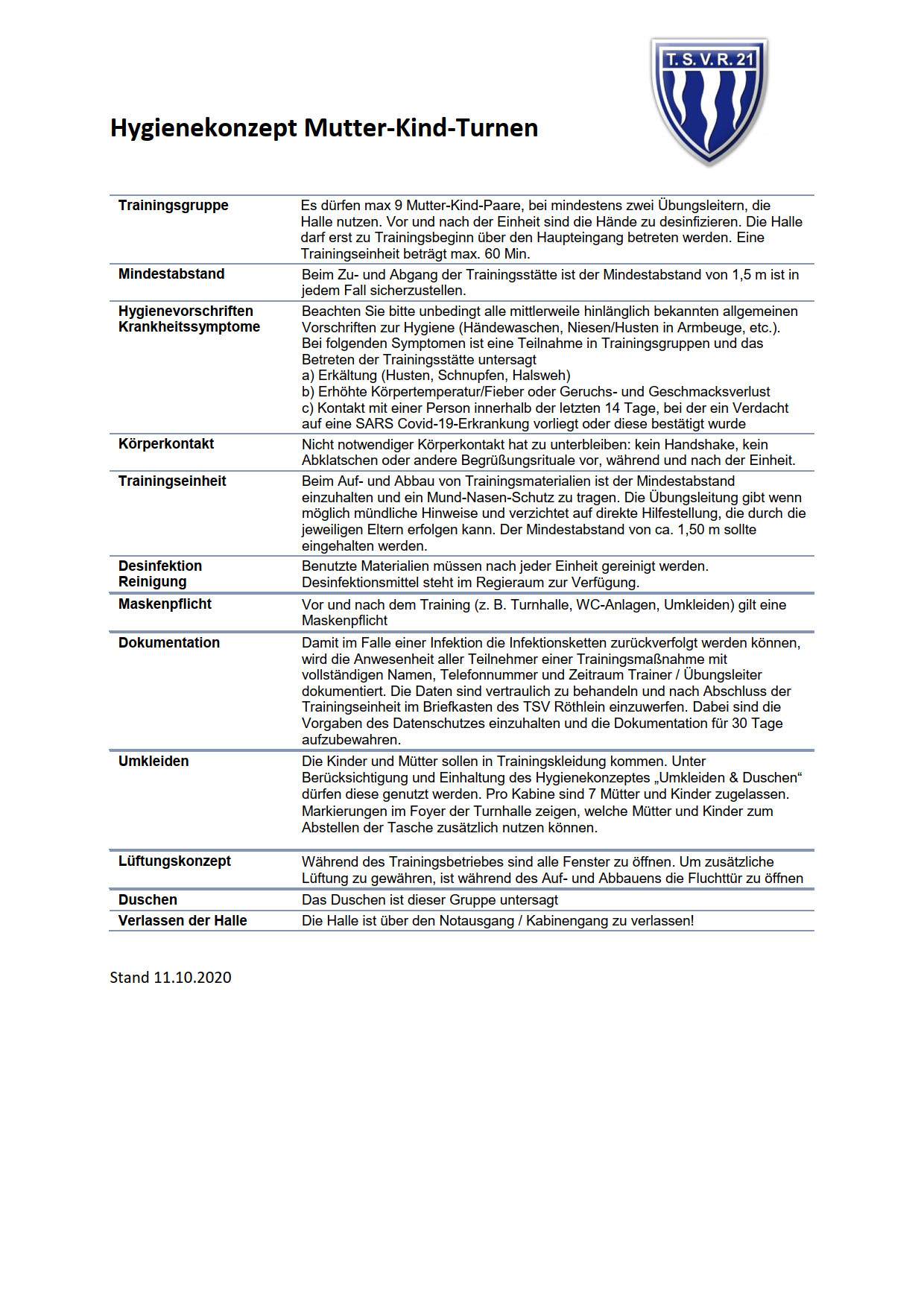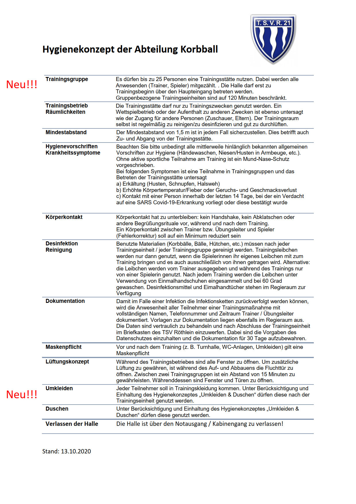 Aktualisierter Sicherheits- und Hygieneplan